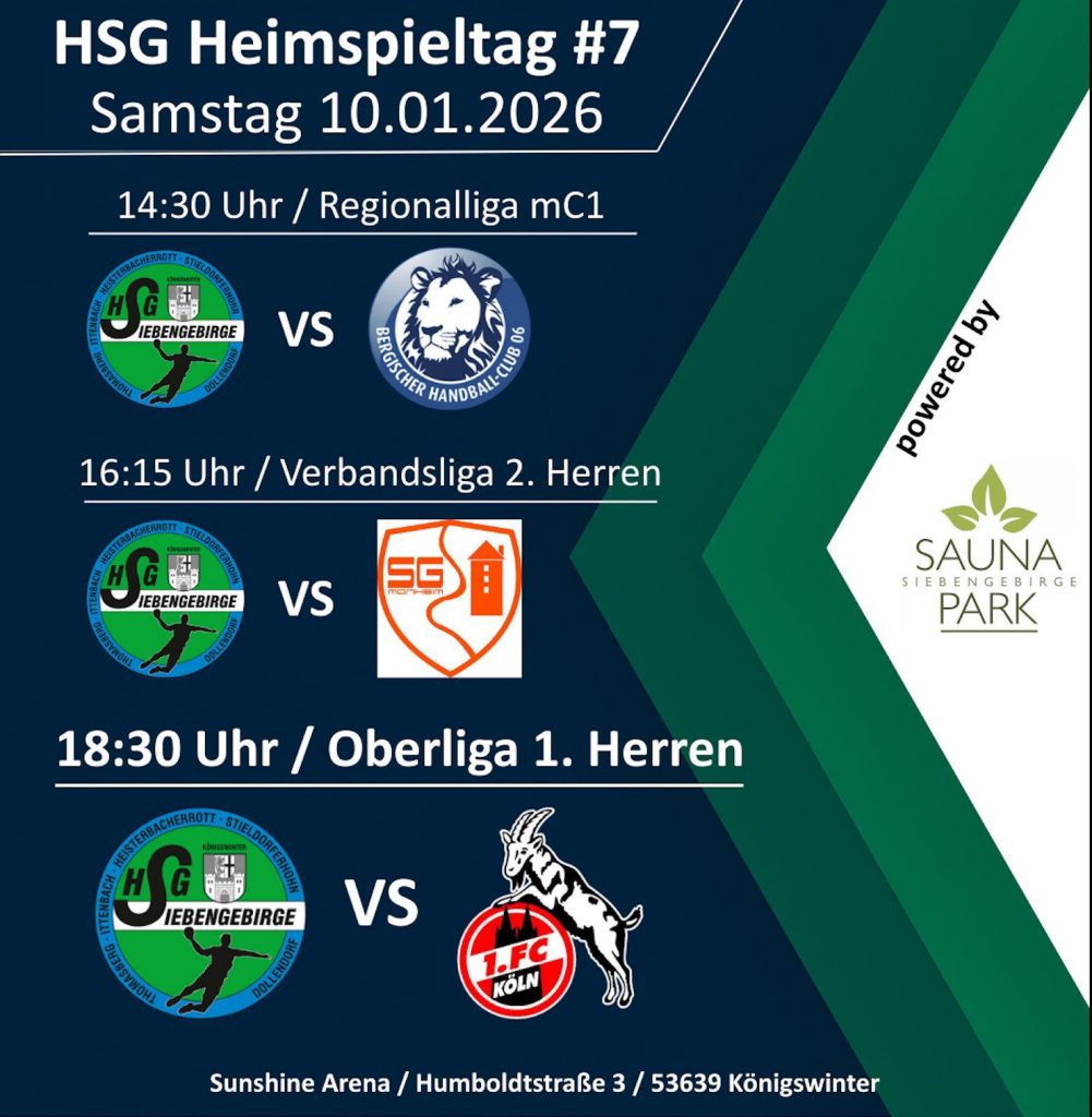 Zum ersten Heimspieltag des Jahres 2026 gibt's für euch heute viel Handball-Action im Jugend- und Seniorenbereich. Dabei sind u.a. die männliche C-Jugend gegenBergischer Handball-Club 06ub 06, die Verbandsliga-Herren gegenSG Monheimnheim und im Abendspiel die Oberliga-Herren gegen den Effzeh!