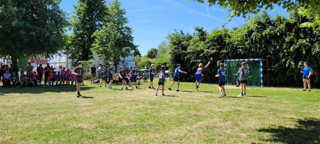 Da in der kommenden Woche für die D1-Mannschaft gleich drei Testspiele gegen die HSG Rösrath-Forsbach, den TuS Königsdorf und die SG Ollheim-Straßfeld anstehen, war die ursprüngliche Planung, am Sonntag, den 12. Juni, eine Pause einzulegen. Damit war auch eine Teilnahme bei den “Sporttagen”, dem Rasenplatz-Turnier der SG Ollheim-Straßfeld, nicht vorgesehen. Allerdings hatte Trainer Philipp Mertens da wohl die Rechnung ohne seine Spieler gemacht. Die Lust auf Handball und ein spaßiges Sommer-Turnier auf dem Rasenplatz bei strahlendem Sonnenschein trieb gleich vier Stammspieler dazu, sich den männlichen D2- und D3-Mannschaften anzuschließen, um auch den Rest des Wochenendes noch mit Handball zu verbringen.