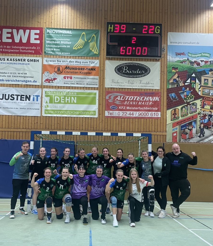 Die Damen aus dem Siebengebirge starteten motiviert mit viel Fokus in die zweite Halbzeit. Sie konnten an ihre Leistung vom Ende der ersten Halbzeit anknüpfen und so einen noch größeren Vorsprung erzielen. Auch mehrere 2-Minuten-Strafen und 4 Siebenmeter gegen die Grün-Blauen änderten daran nichts. Im Verlauf des zweiten Durchgangs hielten die HSG-Damen ihre Leistung konstant und überrannten die Mannschaft aus Schleiden zeitweise regelrecht. Mit einem Endergebnis von 39:22 holten sie mit dem klaren Sieg zum dritten Mal in Folge zwei Punkte und setzen somit ihre Siegesserie mit der bis dato perfekten Punktausbeute in der Kreisoberliga 2025/2026 fort.