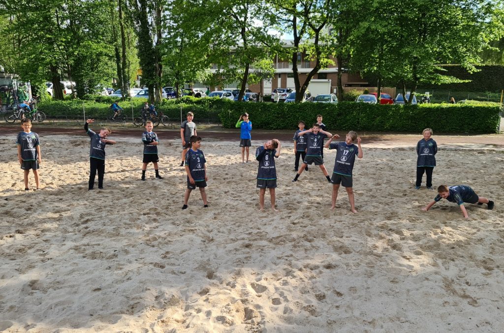 Und das nutzte die männliche D1-Jugend der Grün-Blauen auch gleich mit großer Begeisterung und vollem Elan. Der Handball-hungrige HSG-Nachwuchs trainierte am Dienstag trotz durchgängigem Nieselregen gleich eineinhalb Stunden auf der Beach-Anlage des Sportplatzes in Oberpleis. Allen Kindern war der Spaß anzumerken. Endlich wieder Fangen, Werfen, Abwehr, Angriff und natürlich Tore erzielen!
