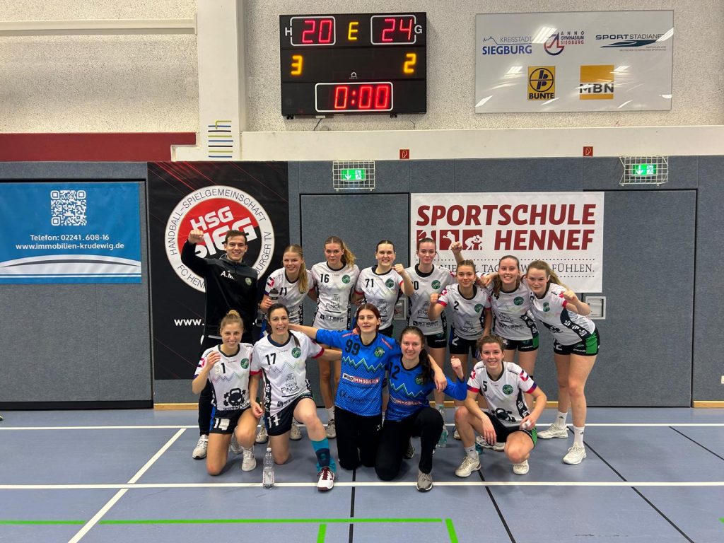 Nach der deutlichen Halbzeitansprache von Trainer Anto Marcinkovic ging ein Ruck durch die Mannschaft. In der zweiten Halbzeit stellten die Grün-Blauen um und konnten mit offensiver Abwehr auf der Mittelposition den Spielfluss der Gegnerinnen in Unordnung bringen. Die Zuordnung in der Abwehr war jetzt besser. Damit konnten die Gäste den Spielverlauf bestimmen, konnten Bälle erkämpfen und kamen ins Umschaltspiel nach vorne. Im Angriff funktionierte das Zusammenspiel, die Siebengebirglerinnen waren gefährlicher und konnten die Abwehrreihen auseinanderziehen. So erarbeiteten sie sich gute Torchancen. Bis zum Spielstand von 22:14 in der 49. Minute für die Grün-Blauen blieben die Gastgeberinnen weitestgehend chancenlos, den Spielverlauf nochmals zu ihren Gunsten zu drehen – auch dank einer gut aufgelegten Leah Klinger im Tor der HSG. Dann kam wieder ein Bruch ins Spiel der HSG-Damen und die Siegburgerinnen konnten in den letzten 10 Minuten sechs Tore erzielen. Doch schlussendlich mit vier Treffern Vorsprung konnten die Grün-Blauen das Spiel für sich entscheiden. Mit einem Stand von 12:8 in der 2. Hälfte war der Ausgang für die Siebengebirglerinnen glücklich und es kam zum Endstand von 24:20 für die Gäste aus Königswinter.