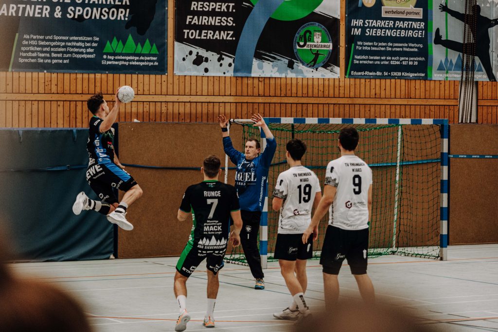 Der Grundstein für den klaren Erfolg wurde durch eine wieder starke Abwehr der HSG gelegt. Von Beginn an fanden die Rheinbacher keine Lösungen gegen die agile, aggressive Abwehr der HSGler und scheiterten immer wieder am starken HSG-Torwart Florian Löcher. Nach 19 Minuten stand es bereits 11:4 und die Siebengebirgler machten nicht den Anschein, noch einmal nachzugeben. Während die Gäste aus Rheinbach immer wieder lange für ihre Tore kämpfen mussten, gelangen den Siebengebirglern schnelle, einfache Tore nach Ballgewinnen oder schön herausgespielte Tore im Positionsangriff. Somit konnten die Grün-Blauen mit einem 16:9 in die Kabine gehen.