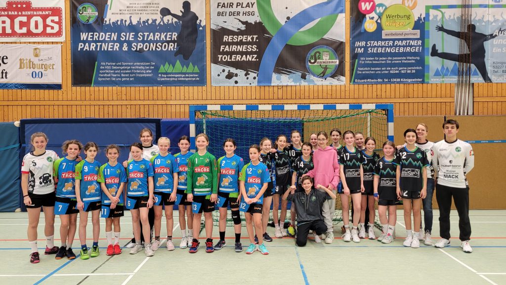 Die Eltern der Mädchen der beiden HSG-Teams sowie die vielen weiteren Zuschauerinnen und Zuschauer am Samstagvormittag in der Oberpleiser “Sunshine Arena” konnten sich davon überzeugen, dass alle Spielerinnen im Vergleich zur Hinrunde große Fortschritte gemacht haben. Mit großer Ballsicherheit, einigen taktischen Spielvarianten und hohem Tempo gingen die Kontrahentinnen in die vielen spannenden Spielsituationen der Partie. Die Schützlinge vom Trainer-Duo Armin und Paula Reckers der “D2 und D3” sowie die “erste Mannschaft” der Verantwortlichen Frederik und Petra Nüsse waren von der ersten Minute an konzentriert bei der Sache.