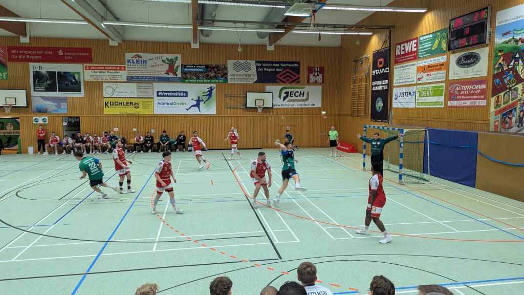 Obwohl die Grün-Blauen auf Oliver Dziendziol, Bjarne Steinhaus, Luca Weber und Konstantin Lutz verzichten mussten, konnte die HSG schnell die Kontrolle über die Partie erlangen. Ab der 5. Minute legten die Grün-Blauen kontinuierlich vor (5:4) und gingen in der 13. Minute erstmals mit zwei Toren in Führung (9:7). Einzig technische Fehler im Aufbauspiel sowie fehlende Kompromisslosigkeit in der Abwehr sorgten dafür, dass die Gäste aus Palmersheim weiterhin in Schlagdistanz waren.