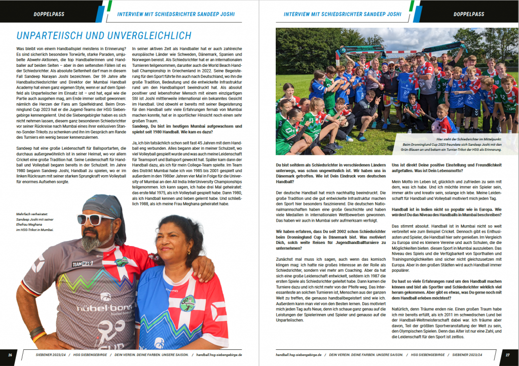 Der 59 Jahre alte Handballschiedsrichter und Direktor der Mumbai Handball Academy hat einen ganz eigenen Style, wenn er auf dem Spielfeld als Unparteiischer im Einsatz ist – und hat, egal wie die Partie auch ausgehen mag, am Ende immer selbst gewonnen: nämlich die Herzen der Fans am Spielfeldrand. Beim Dronninglund Cup 2023 hat er die Jugend-Teams der HSG Siebengebirge kennengelernt. Und die Siebengebirgler haben es sich nicht nehmen lassen, diesem ganz besonderen Schiedsrichter vor seiner Rückreise nach Mumbai eines ihrer exklusiven Stanno-Sonder-Trikots zu schenken und ihn im Gespräch am Rande des Turniers ein wenig besser kennenzulernen. Das vollständige Interview ist im gedruckten Saisonmagazin HSG SIEBENER 2023/2024 erschienen.